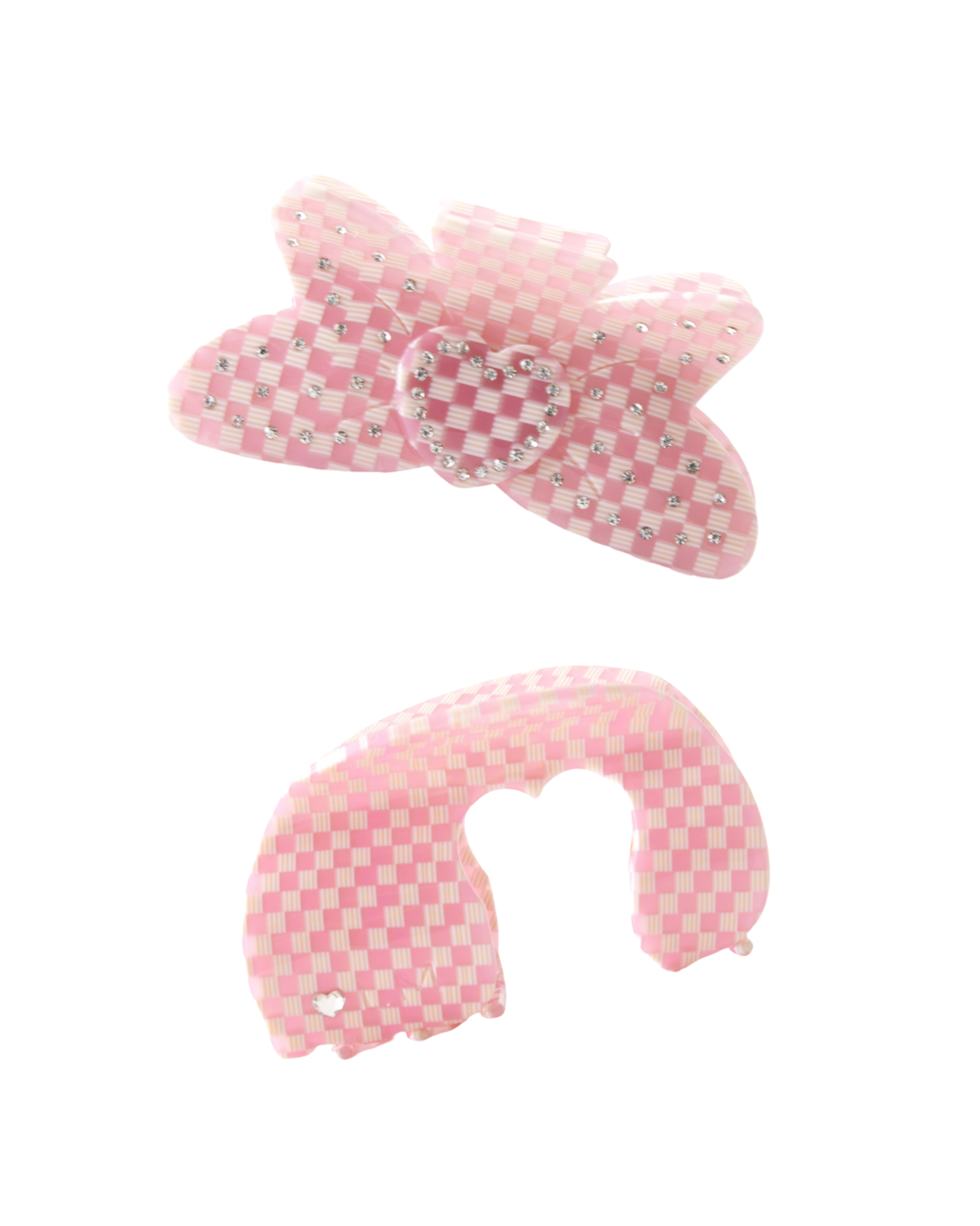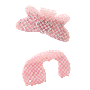 The Pink Princess Bundle (2 Claw Clips): This bundle includes The Bow Claw Clip in Pink Checkers and The Maia Claw Clip in Pink Checkers.